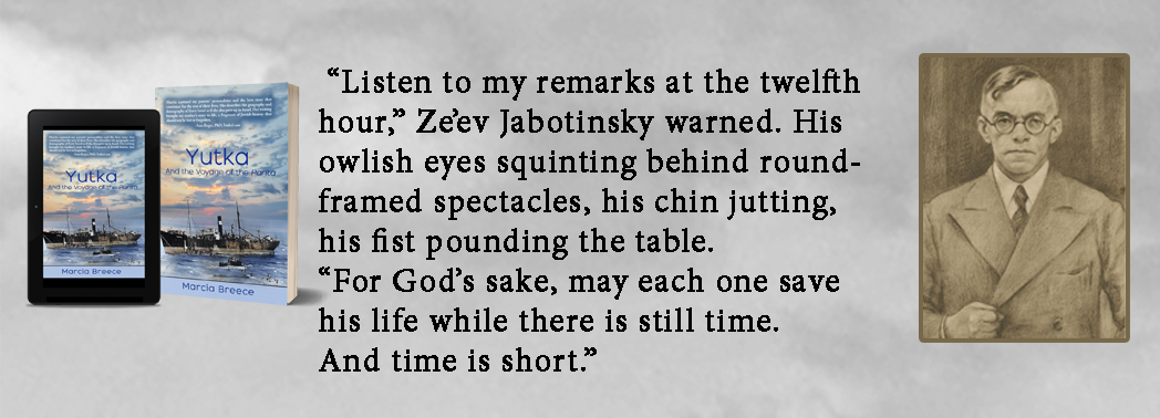 As she scanned the gathering crowd, hoping her aunt and uncle would find her, she remembered Ze’ev Jabotinsky’s presentation to her Betar Youth Group nine months before, her ultimate motivation to immigrate to Eretz Israel. “Listen to my remarks at the twelfth hour,” Ze’ev Jabotinsky warned. His owlish eyes squinting behind round-framed spectacles, his chin jutting, his fist pounding the table. “For God’s sake, may each one save his life while there is still time. And time is short.”