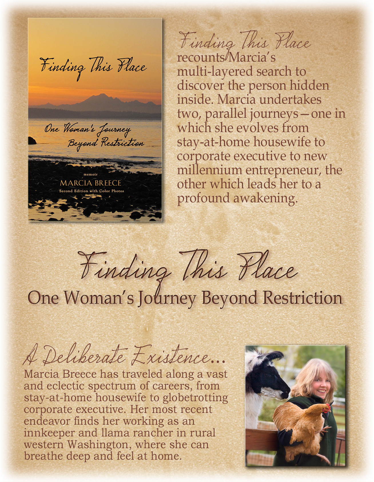 Finding This Place beautifully recounts Marcia’s remarkable journey as she breaks the chains of Training and struggles to find the person within. Her story will inspire each reader to follow their own path, no matter how bumpy, and inevitably arrive at that place that is uniquely their own.
