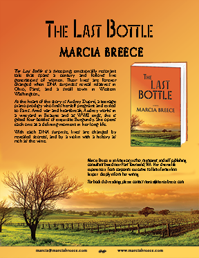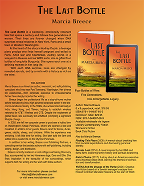Set in the USA and France from 1923 to 2023, Last Bottle of Burgundy follows three uniquely talented women, their lovers, husbands and progeny. With food and music as significant as the characters, Last Bottle of Burgundy is a story of DNA results that shatter family legends, launch sibling antipathy, and reveal the legacy that brings generations together.